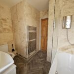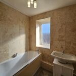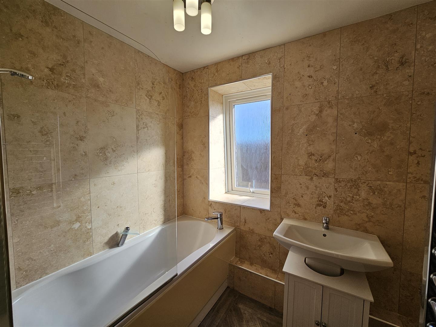 Vinyl flooring, heated towel radiator, white suite comprising: bath, basin and w/c, part mirrored, fully tiled walls and window.