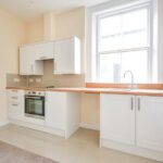 Tiled flooring, white wall and base units with worktop over, stainless steel sink and drainer with mixer tap, electric oven and hob, space and plumbing for a washing machine, wooden single glazed sash window looking out to the rear of the building.