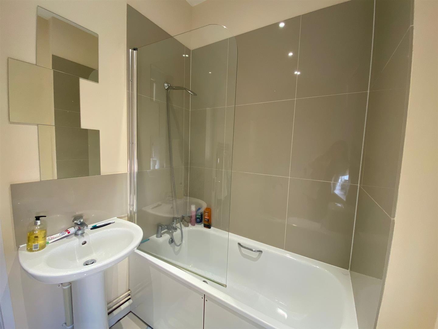 Tiled floor, part tiled walls, white suite comprising of bath with shower, basin, w/c, heated towel radiator, single glazed sash window, cupboard housing electric boiler and hot water cylinder.
