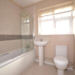 Tiled floor and part tiled walls, white suite comprising: bath with shower over, basin, w/c, heated towel radiator, UPVC window.