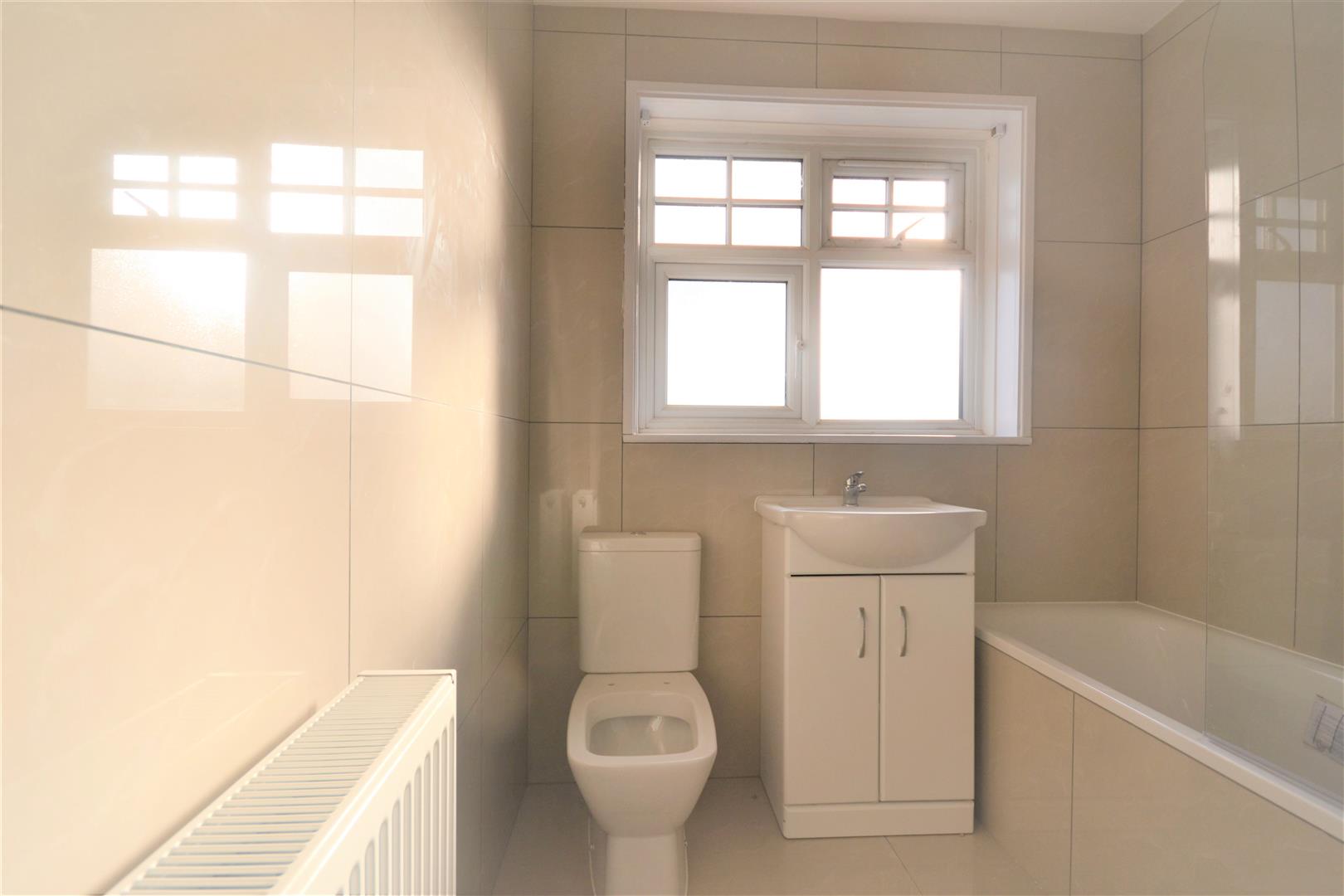 Tiled floor and walls, white suite comprising: bath with shower over, basin, w/c, radiator, UPVC window.