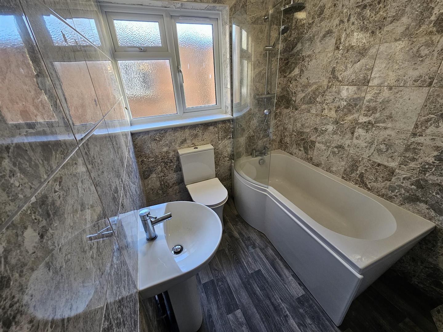 White suite comprising panel enclosed bath with shower over and shower screen, pedestal hand basin and low level W.C. Tiled walls. Double glazed window. Extractor fan.