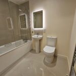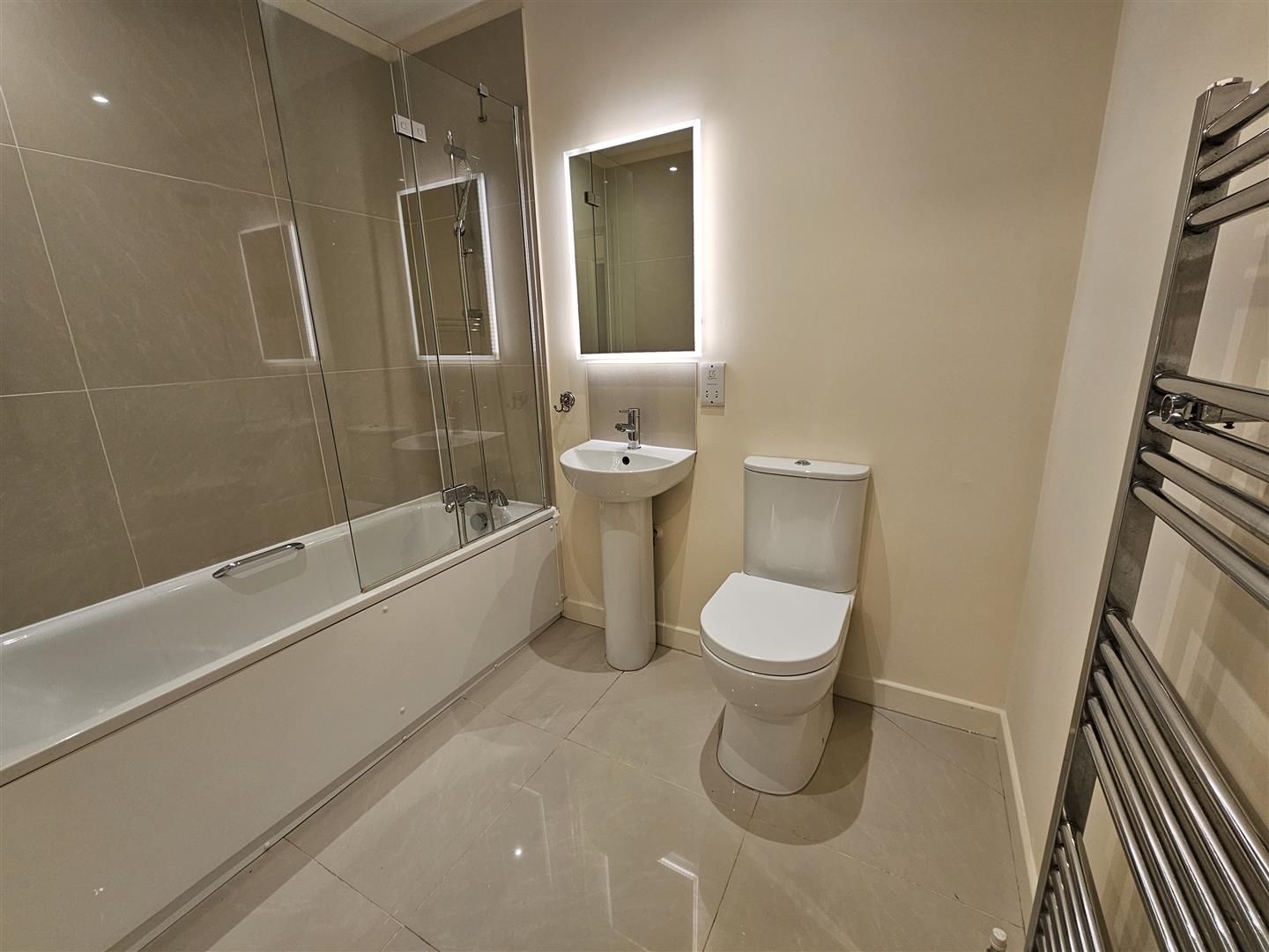 Tiled floor, part tiled walls, heated towel radiator, white suite comprising bath with shower over, basin, w/c, shaver socket.
