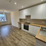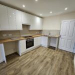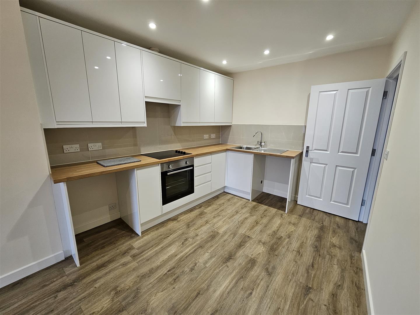 LVT flooring, Gloss white wall and base units with wood effect worktop over, space and plumbing for washing machine, space for under counter fridge, electric oven and hob, stainless steel sink and drainer with mixer tap.